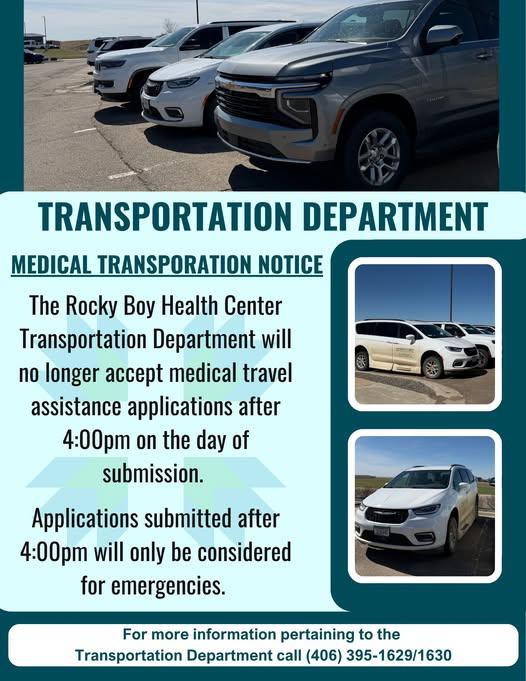 The Rocky Boy Health Center Transportation Department will no longer accept medical travel assistance applications after 4:00 PM on the day of submission.
