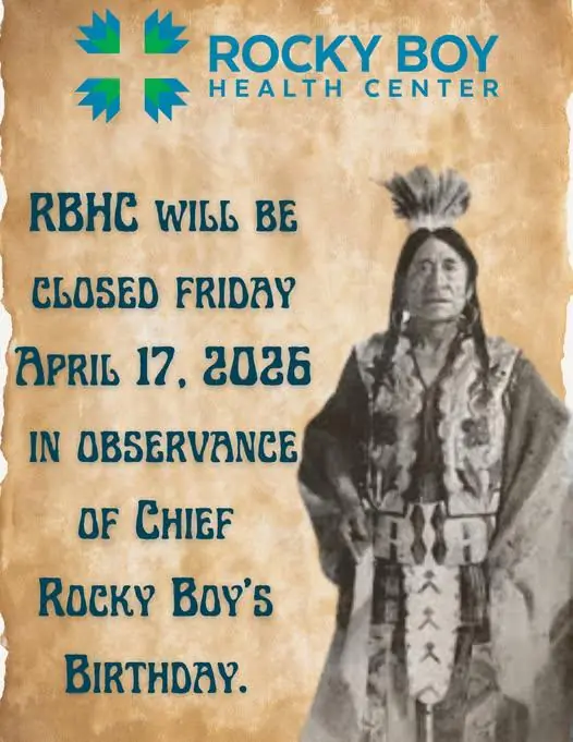 Rocky Boy Health Center will be closed on Friday, April 17th in observance of Chief Rocky Boy's Birthday.