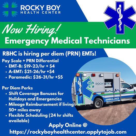 Rocky Boy Health Center EMS is looking for dedicated EMT-Bs, Advanced EMTs, and Paramedics to join our team on a per diem (PRN) basis. Apply today at https://rockyboyhealthcenter.applytojob.com We also have 2 full-time positions with benefits available!