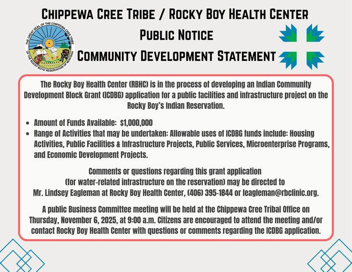 The Rocky Boy Health Center (RBHC) is in the process of developing an Indian Community Development Block Grant (ICDBG) application for a Public Facilities and Infrastructure Project on the Rocky Boy’s Indian Reservation.