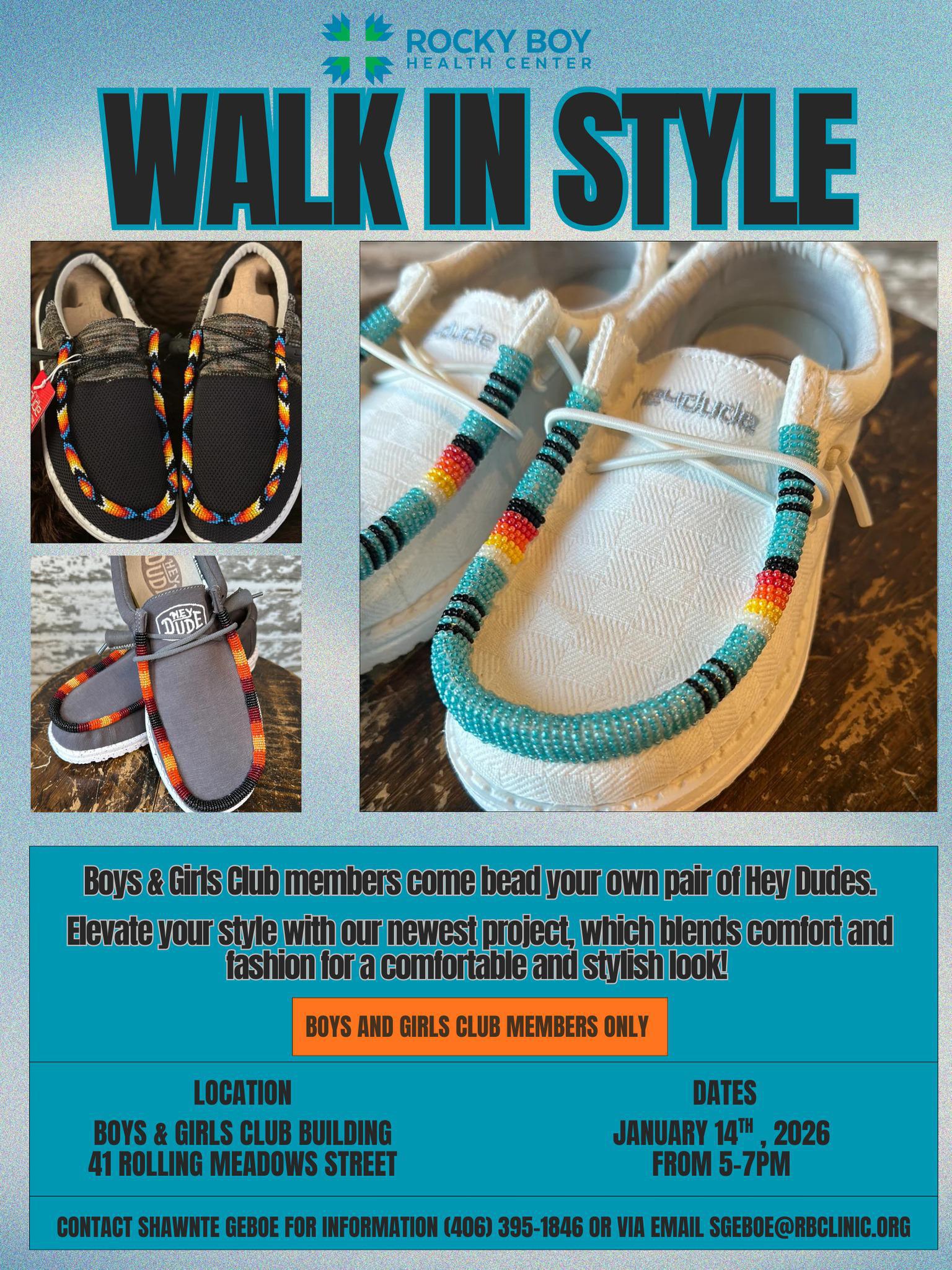 Boys & Girls Club Hey Dude Beading Class January 14, 2026 5:00-7:00pm -For B&G Club members only Boys & Girls Club Building-41 Rolling Meadows Street. For more information contact Shawnte Geboe (406) 395-1846 or via email sgeboe@rbclinic.org